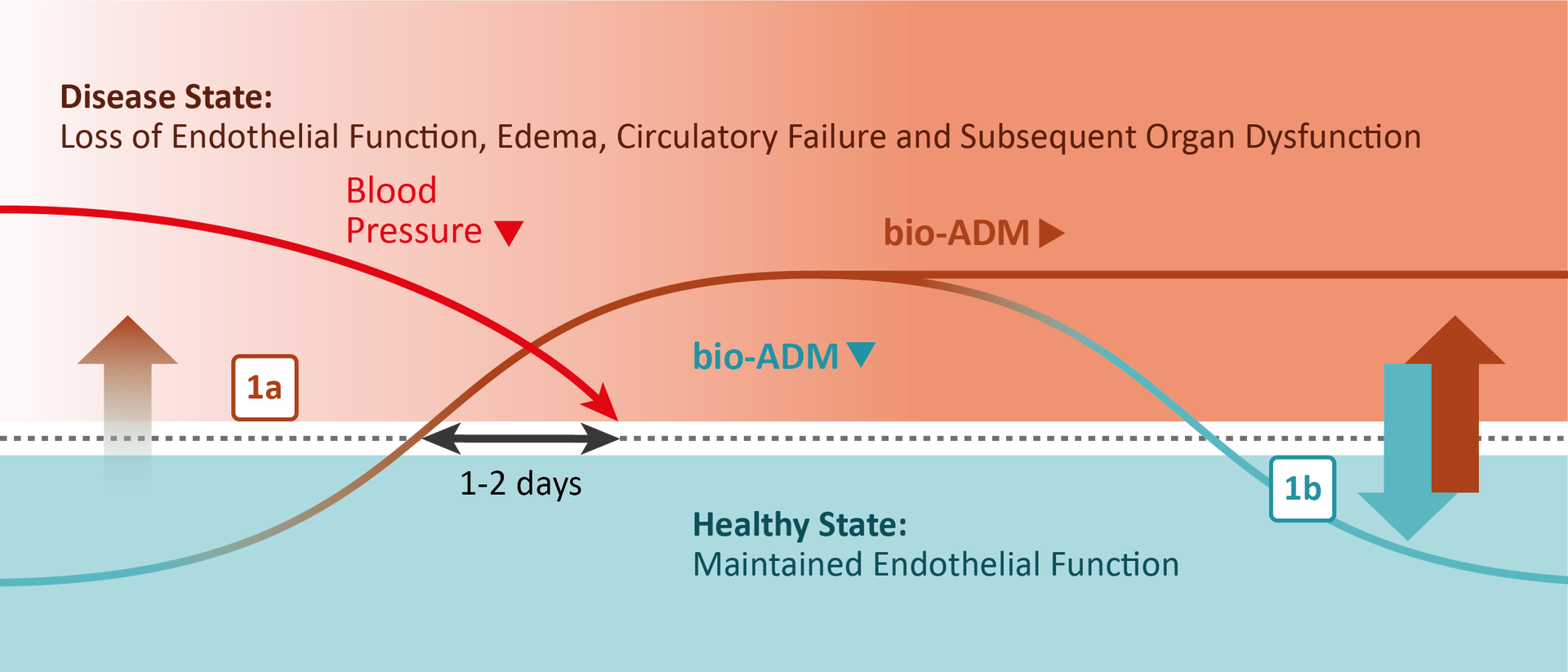 Elevated bio-ADM blood levels predict both blood pressure drop resulting in shock as well as leaky blood vessels leading to the formation of edema [1a]. Decreasing levels of bio-ADM reflect an improvement of the endothelial function, which is closely associated with the patient’s clinical condition [1b] (7).