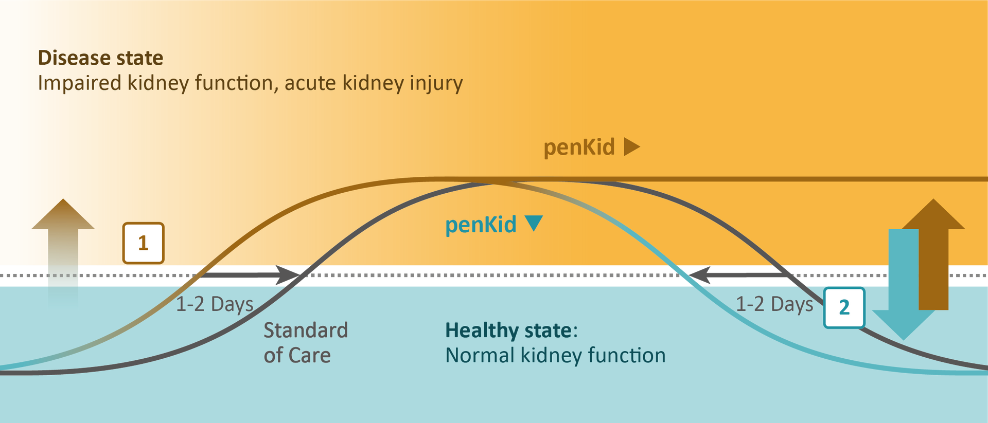 Independent of common comorbidities (e.g. hypertension and diabetes) and the frequently occurring inflammation in critically ill patients, rising penKid blood levels [1] predict acute kidney injury up to 48 hours earlier than today’s standard of care (16) and decreasing penKid blood levels [2] indicate the improvement of kidney function (2).