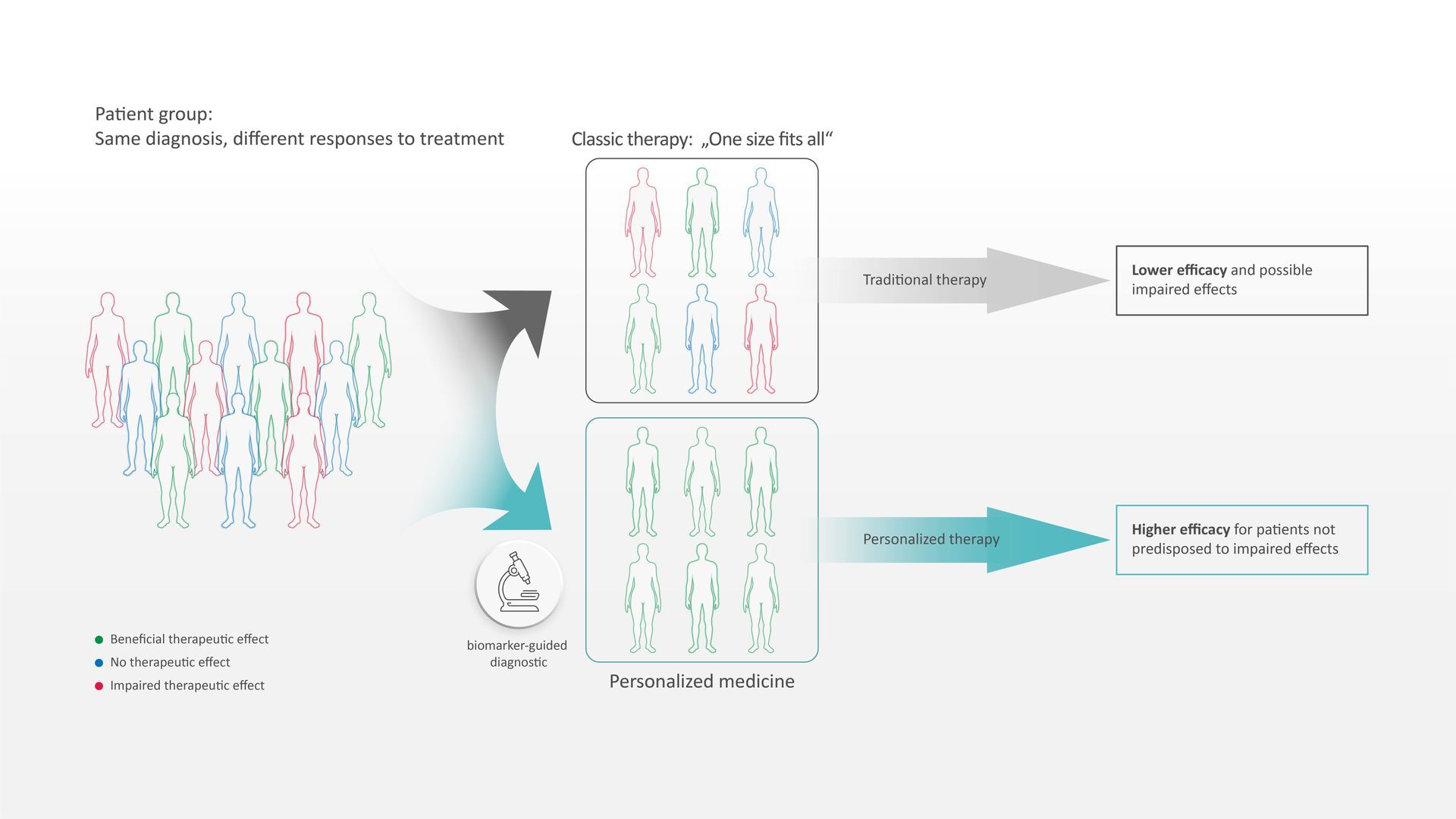 A uniform therapy for all patients with similar disease symptoms results in a wide spectrum of standard medication efficiency. It ranges from very good efficacy to complete inefficacy to severe side effects. So far, the previous motto was: one drug for all. Today, diagnostic tests can be used to determine in advance which medicine is or is not the right one for the respective patient. With the help of prior diagnostics, patients can now be treated target-oriented without any unnecessary trials and errors. A wish that has always existed.